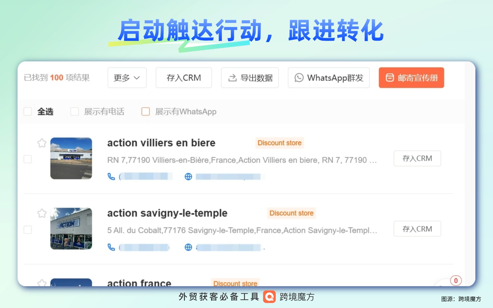 - 启动触达行动,跟进转化:可点击筛选有电话,有WhatsApp,全选企业。给他们群发短信,收藏企业,存入CRM,导出数据,群发Whatsapp
