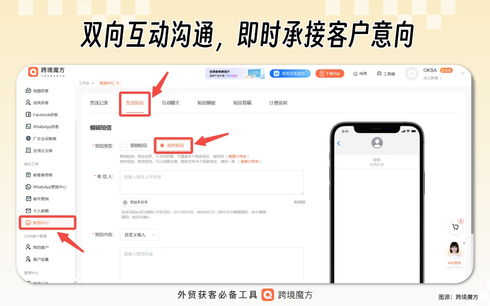 展会是外贸人对接全球客户、拓展海外市场的核心场景,无论是参加美国行业展会、广交会还是各类专业展会,精准邀约目标客户到场交流,直接影响展会成交转化率。但传统展会邀约面临 “客户联系方式零散、沟通渠道单一、回复率低、时区适配难” 等问题,导致大量潜在客户错失,展会投入难以转化为实际订单。跨境魔方商务短信功能,以 “可回复沟通、批量精准触达、智能适配场景” 为核心优势,成为外贸人展会邀约的高效获客工具,让全球客户邀约更便捷、沟通更顺畅。