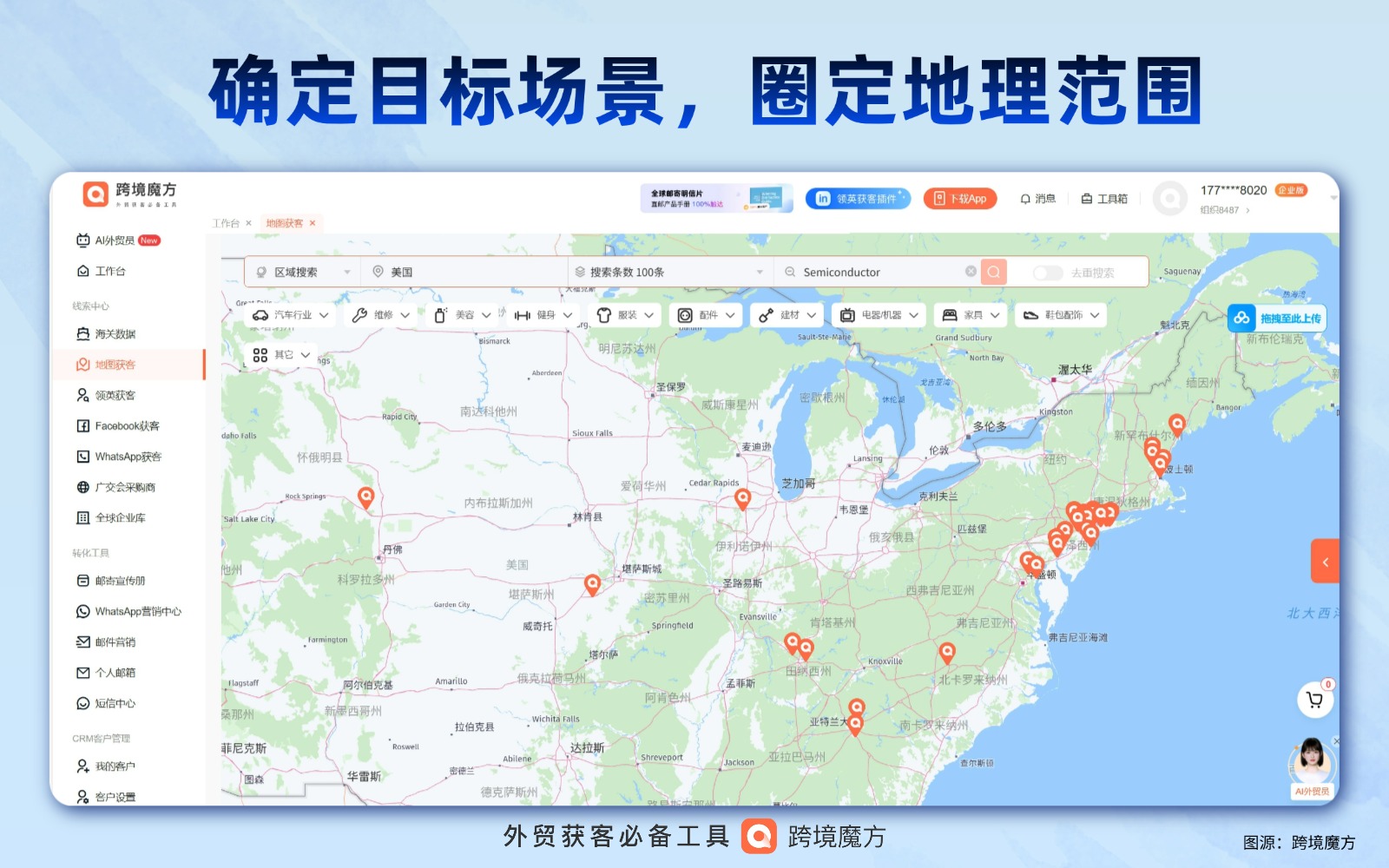 - 确定目标场景,圈定地理范围:企业登录跨境魔方【锚文本链接:https://www.upkuajing.com/knowledge/wenda/24541】系统,进入地图获客模块,选择区域搜索选择目标国家或地区,设置搜索条数,搜索栏下方有关键词分类,可以直接点击关键词进行查找。例如企业想要开拓美国市场,可先选择美国,然后通过关键词搜索Semiconductor,地图上就会显示所有相关企业。