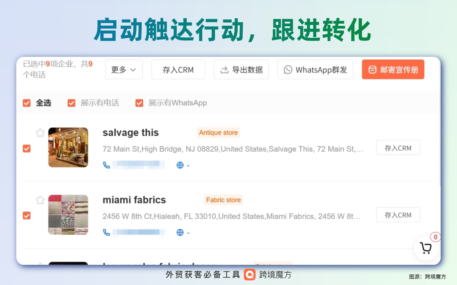 启动触达行动,跟进转化:可点击筛选有电话,有WhatsApp,全选企业。给他们群发短信,收藏企业,存入CRM。