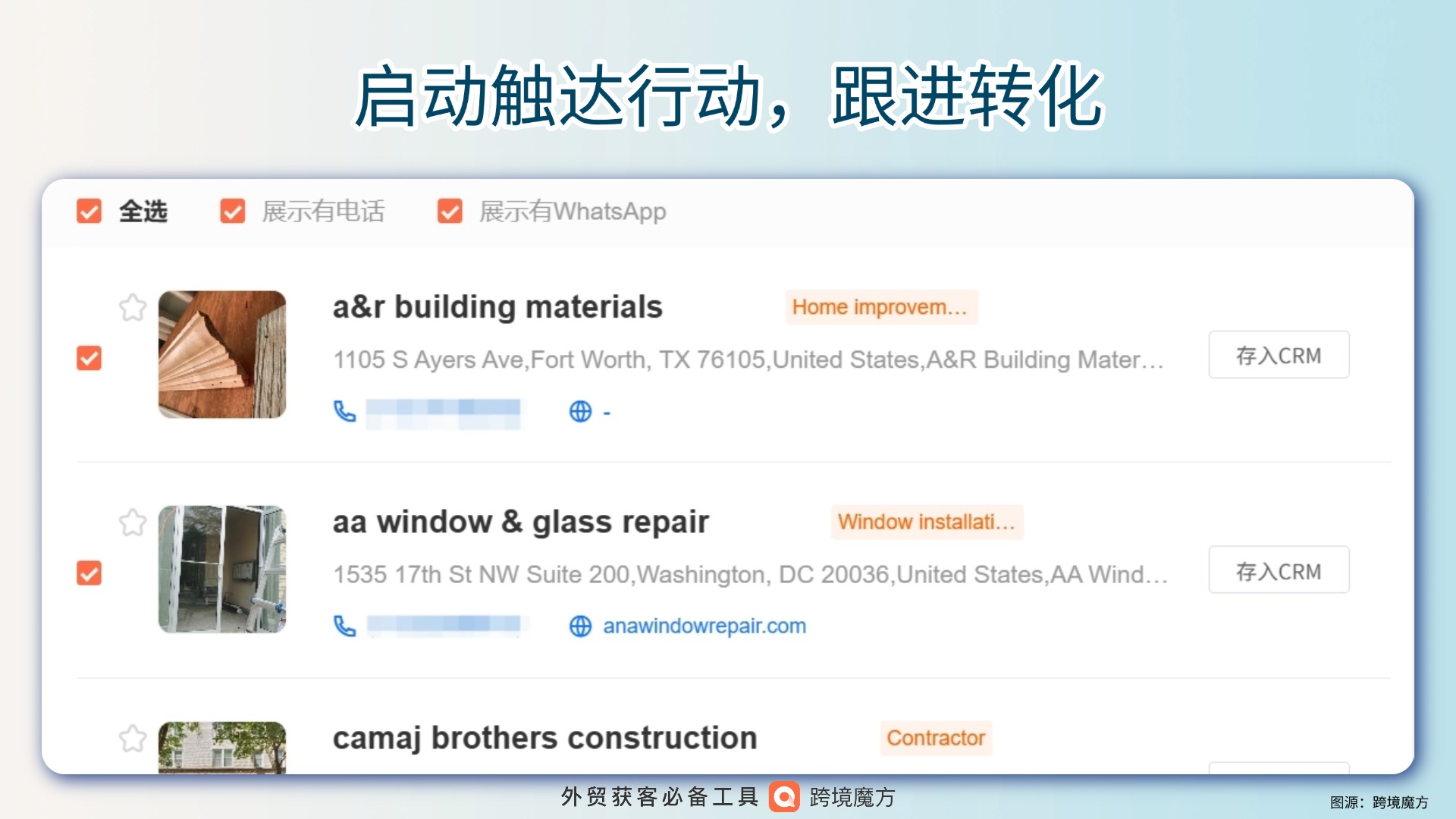 启动触达行动,跟进转化:可点击筛选有电话,有WhatsApp,全选企业。给他们群发短信,收藏企业,存入CRM。