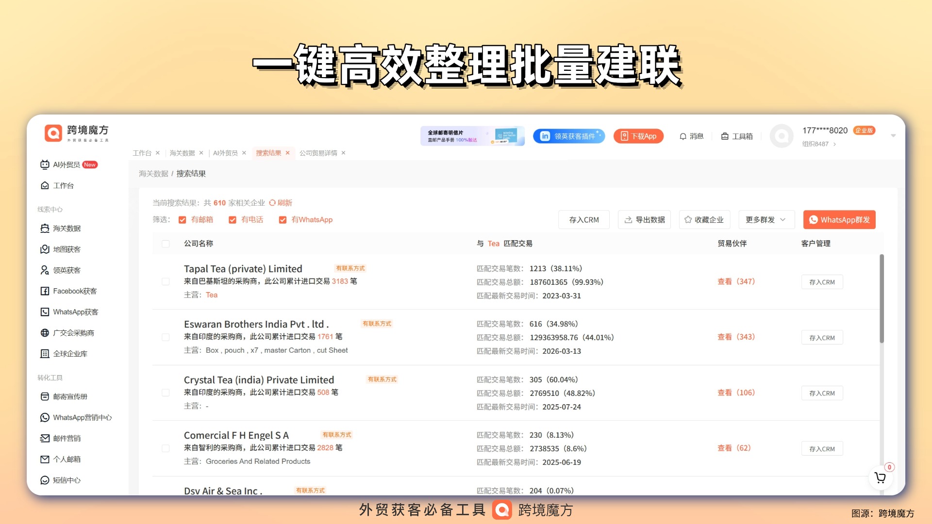 输入茶叶 HS 编码(如 0902.10 绿茶、0902.20 红茶)或关键词,按目的国、采购频次、采购量精准筛选,直接锁定有真实进口记录的采购商跨境魔方。一键获取企业全称、官方邮箱、社媒账号、联系方式,跳过无效沟通环节,直接对接贸易商、经销商、品牌方等核心买家,大幅提升开发效率与线索质量。