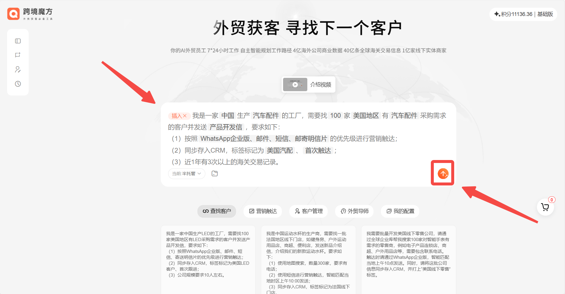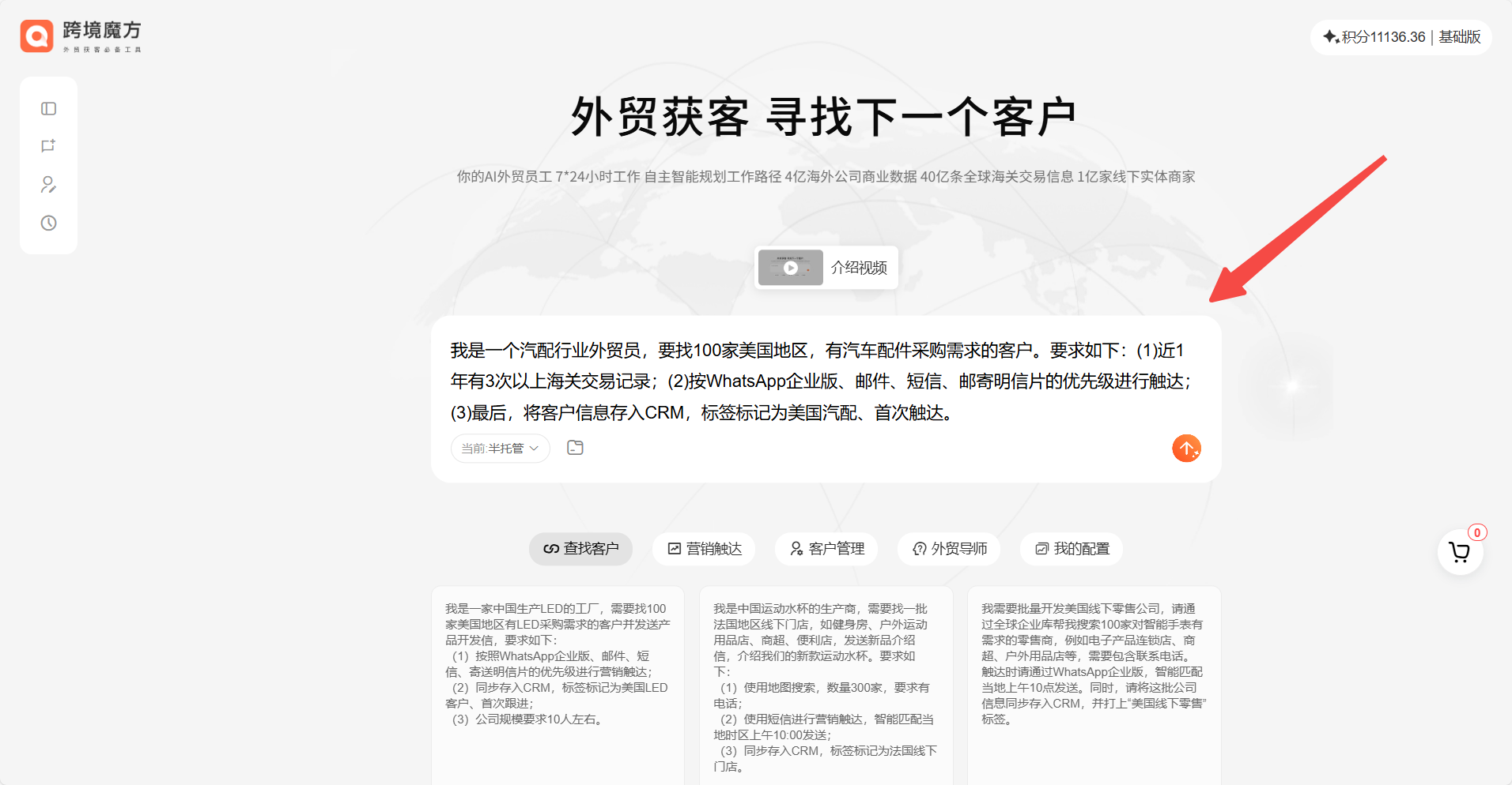 进入【AI 外贸员】页面,可以直接在对话框输入你的获客需求。