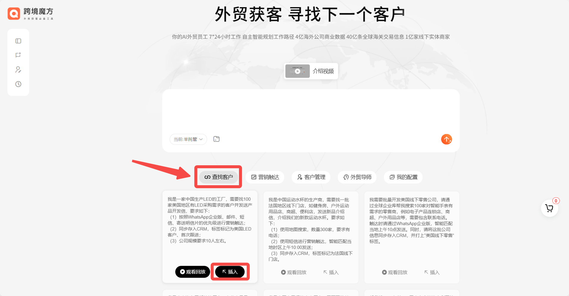 当然您也可以在下方的案例模板进行选择。以我们的获客需求为例,选择【查找客户】板块中的第一个案例模板,并点击【插入】这个获客指令模板。