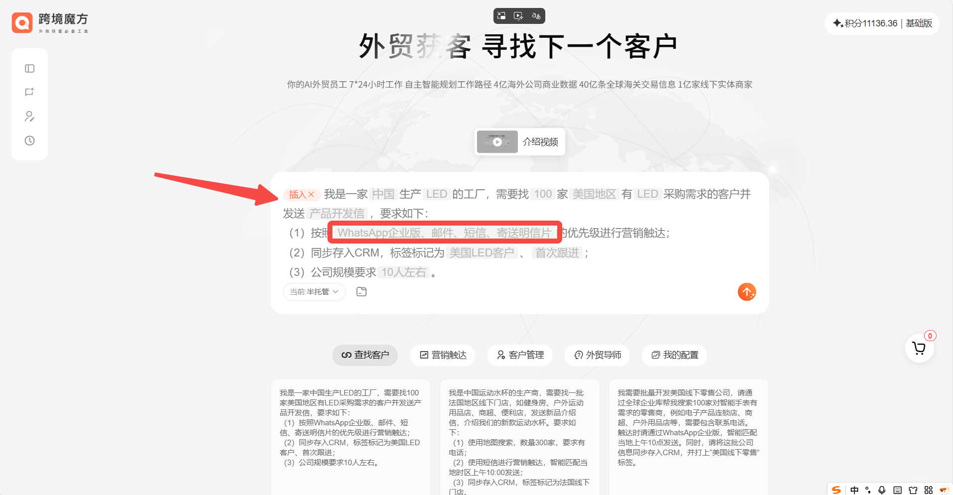 您可以在浅色方框部分,根据自己的获客需求进行填写。也可以对获客指令模板进行删减,改写等。