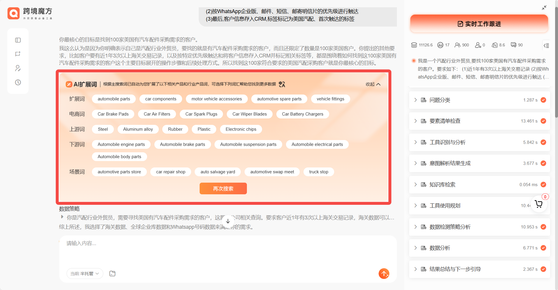 比如我们想开发的是汽配行业的客户,他就会根据根据汽配行业上下游供应链等图谱,扩展出更可能会找到潜在客户的搜索词。突破了我们找客户的思维定式,助力搜索到更多潜在商机。