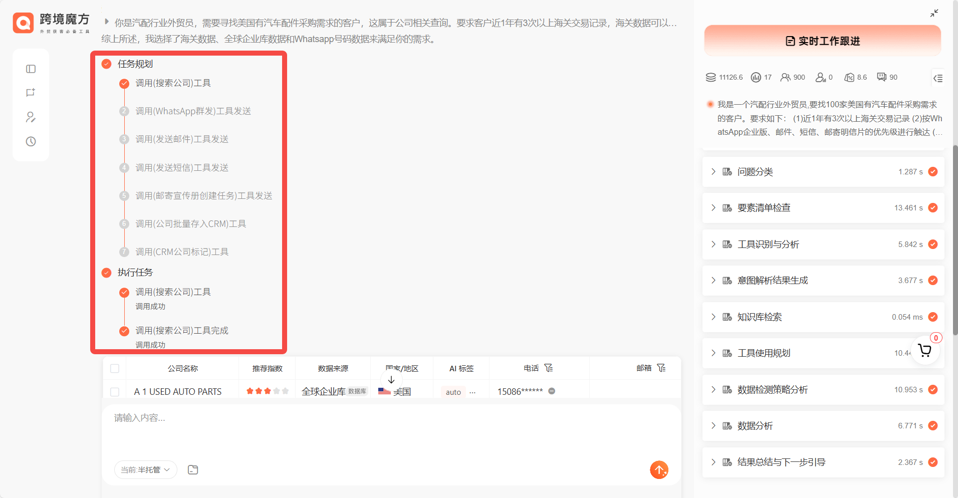 根据获客任务指令,AI外贸员会模拟资深外贸专家,规划出最优的任务路径。 并根据任务规划,依次调用内置工具,执行获客任务。