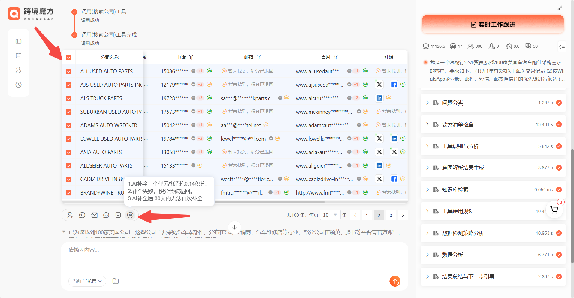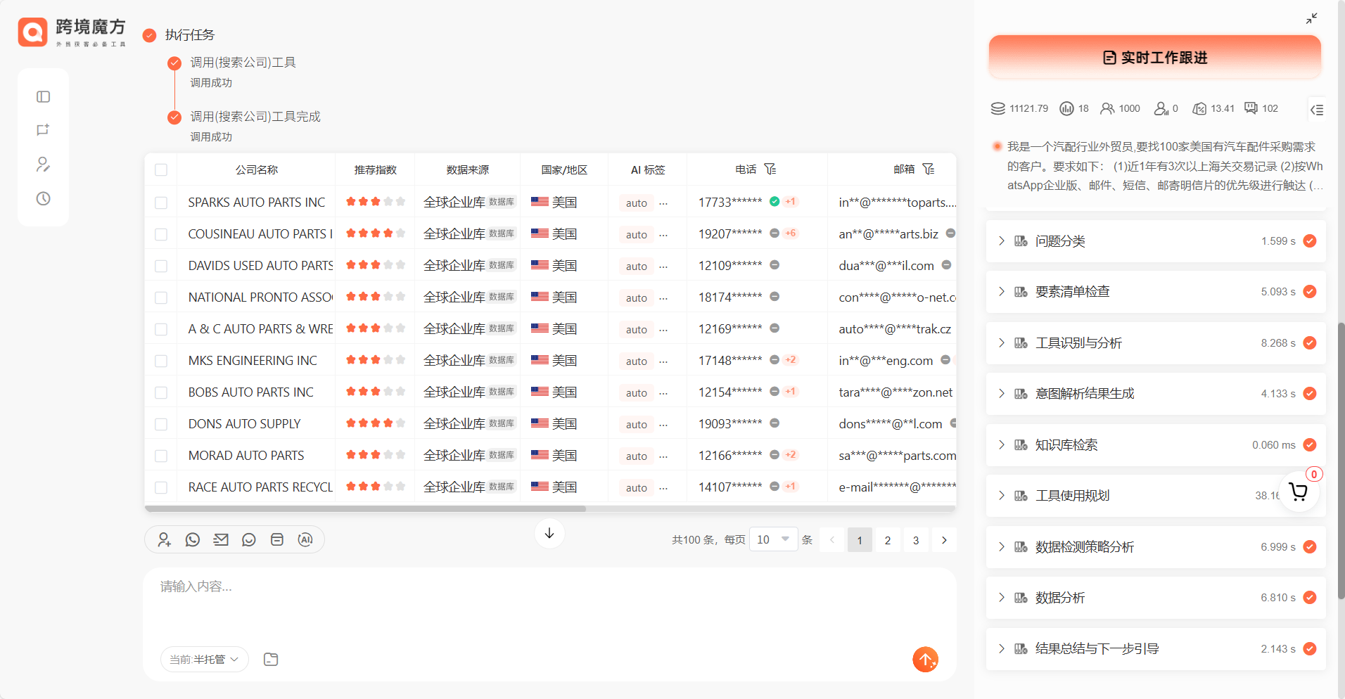 他会调用搜索工具,在海关数据、谷歌地图数据、全球企业库等多个数据源中,搜索更符合我们需求的客户。快速筛选出更匹配我们业务的客户线索。