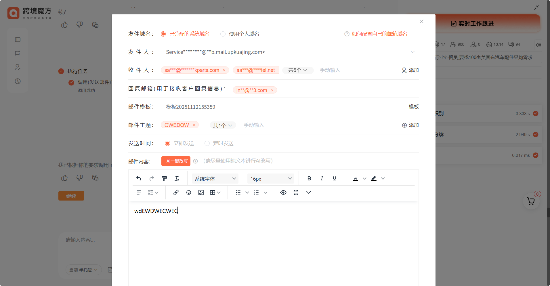 在邮件群发页面,可以选择邮件发送的基础信息,以及用AI进行内容优化改写,提高客户的回复率。