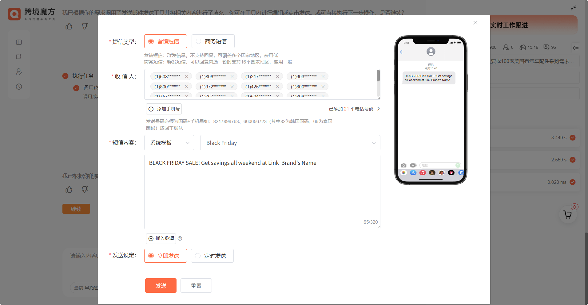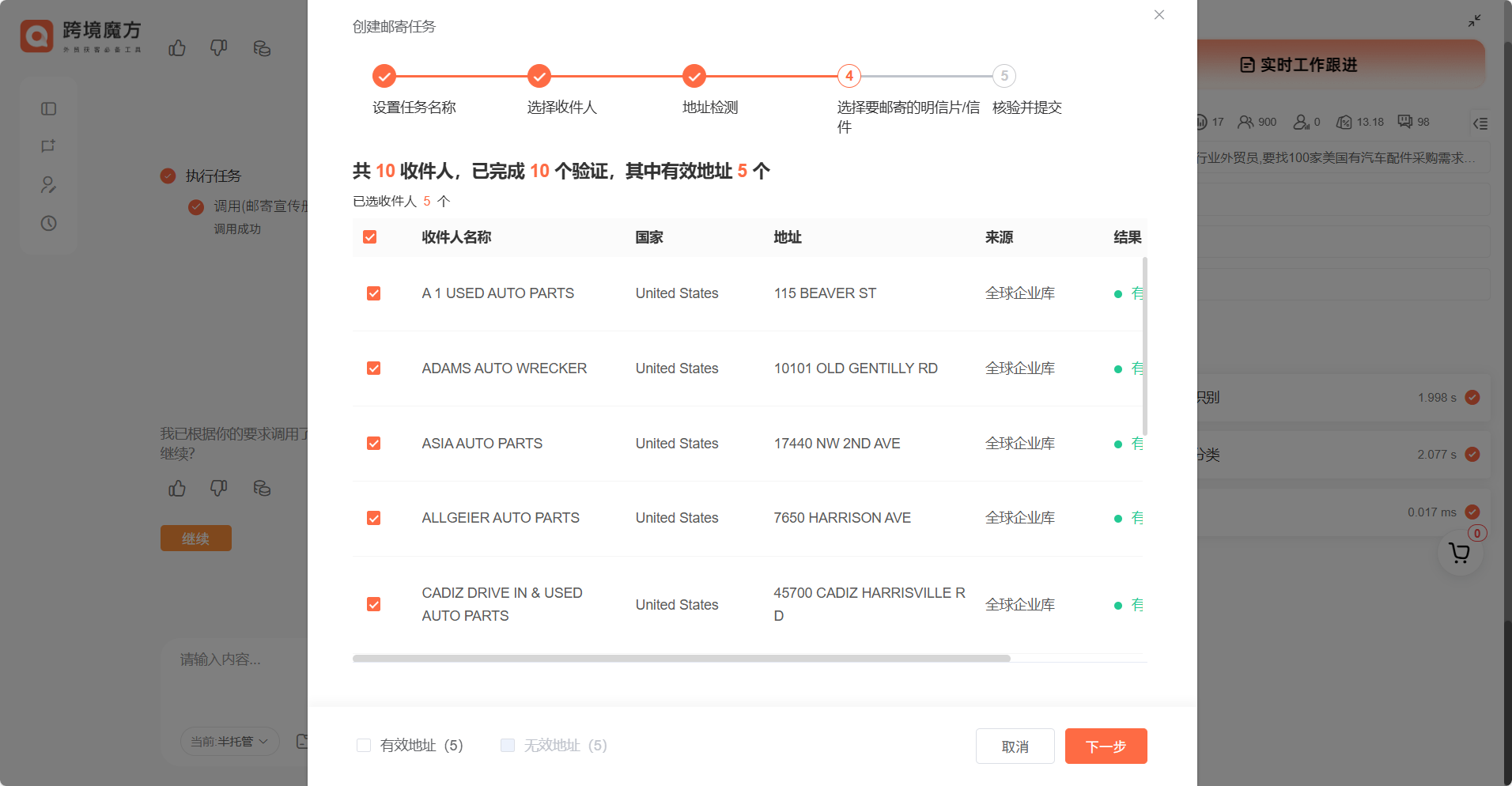 AI 外贸员可以依次调用WhatsApp群发、邮件群发、短信群发、邮寄宣传册等工具,快速触达意向客户。在每次营销内容发送前,都会对目标客户联系方式的准确性进行检测,确保营销效率。