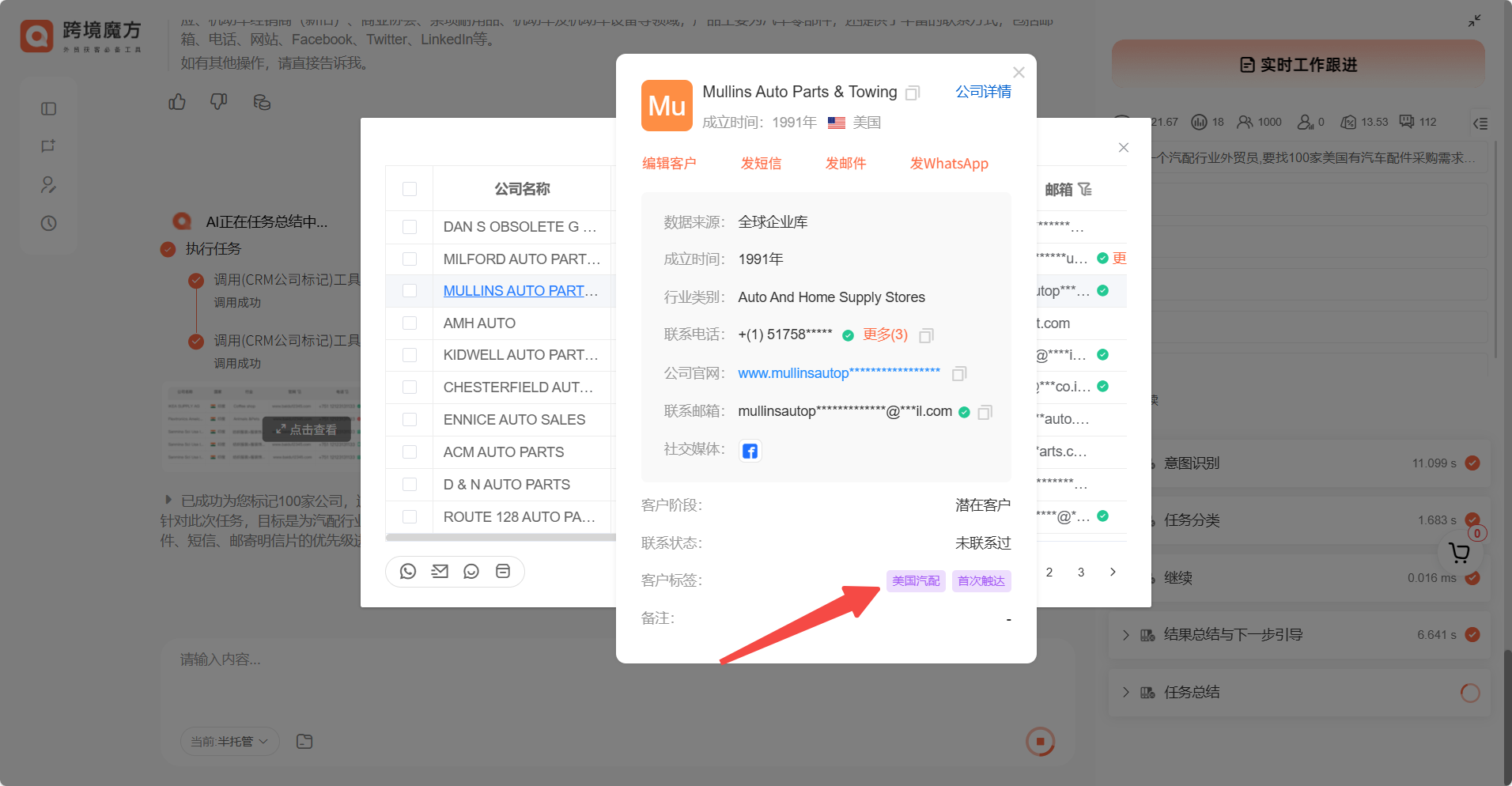 根据获客指令,AI外贸员可以自动将本次搜索到的意向客户存入CRM系统,并且根据指令要求,打上客户标签。方面后续多轮跟进。