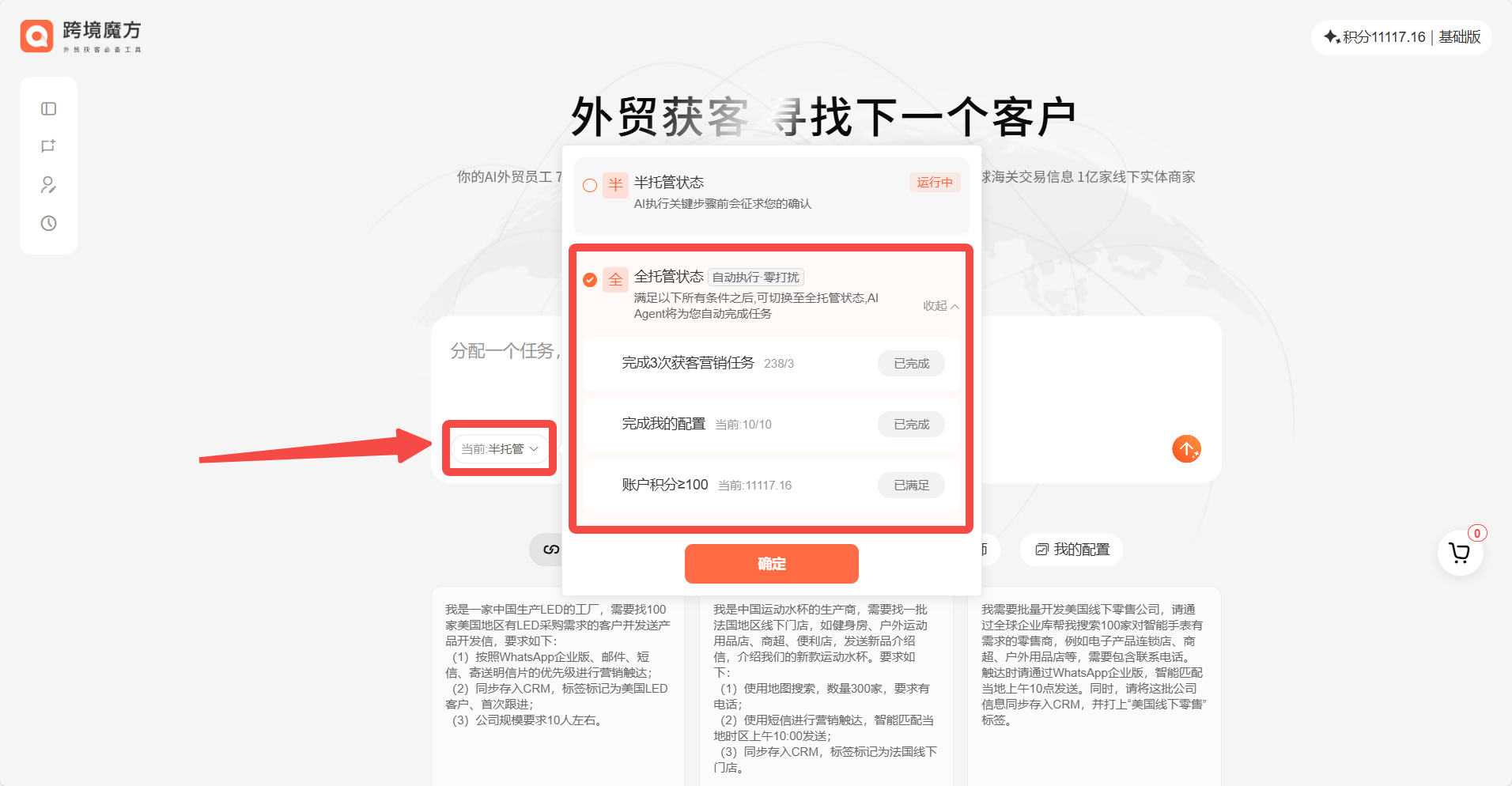 当您已经完全熟悉了AI外贸员的获客流程,就可以选择【全托管】状态,满足全托管要求后,方可正式开启。