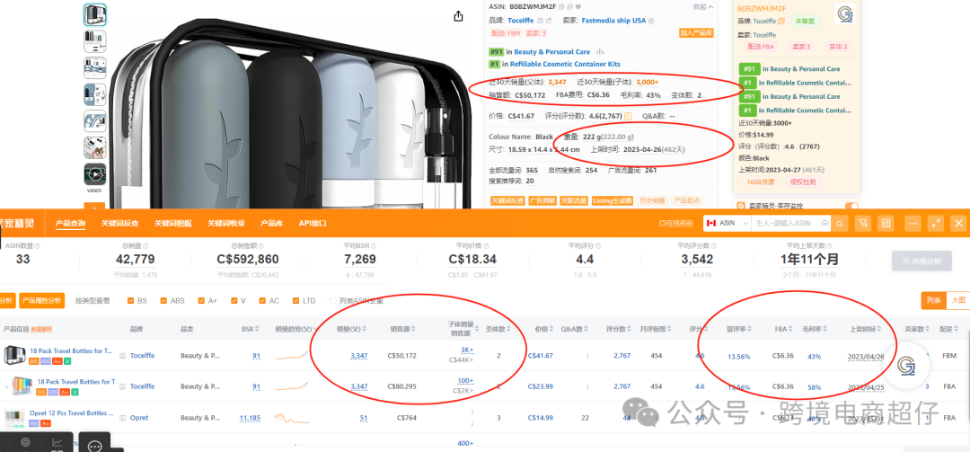 单量:在卖家精灵中显示上架时间是2023年04年26号,目前为止持续销售462天,30天销售量父体(3347),子体销量(3000+)