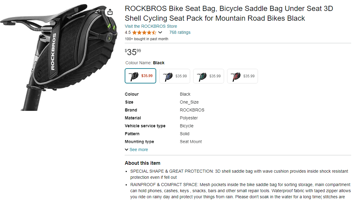这款马鞍包是骑行者的完美配件,采用防震、防雨材料制成,可以抵御恶劣天气,并有足够的空间存放维修工具、钥匙、零食和所有必需品,同时该产品还配有反光带,可提高夜间骑行时的可见度。产品价格为35.99美元 ,有4种颜色可供选择,男性消费者占比80%。产品近30天销量为205件,毛利率为64%。