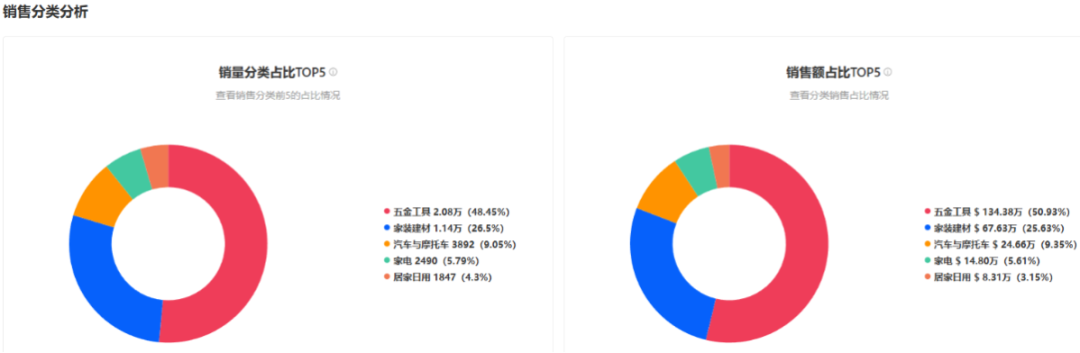 该小店销售分析可以看出销量、销额都是五金最高,占比分别为48.45%、50.93%,其次为家装建材,销量销额占比分别为26.5%、25.63%,主推五金家居、家装建材。