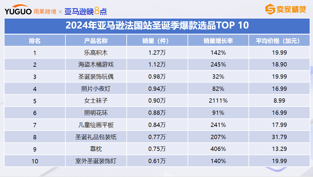 在亚马逊法国站爆款TOP10中,乐高积木以1.27万件销量高居榜首,海盗木桶游戏位居第二,其241%的增长率则为玩具类最高,与玩具有关的产品还有儿童绘画平板,排行第七。其余产品中,女士袜子的同比增长最高,达到了2111%。