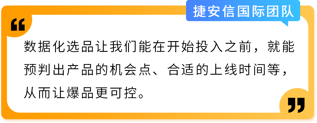 在捷安信国际看来,选品的关键不在于盲目努力,而在于精准的市场洞察和数据分析。因此进入市场前,团队首先会花上三个月左右的时间分析大盘有多少市场空间、利润率大概在哪个区间、市场的价格区间大概是多少,确保后续每一个决策都能建立在扎实的数据基础之上。