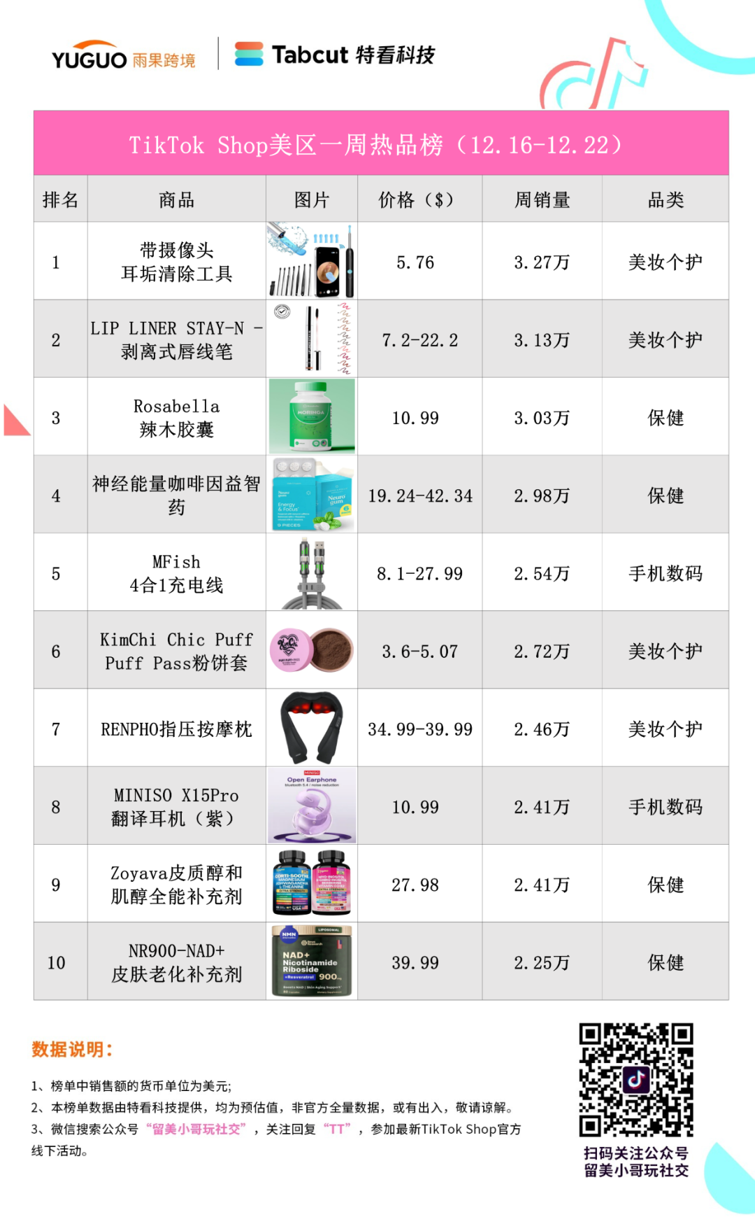 以下是本期(2024年12月16日—12月22日)TikTok Shop 美国站一周热品数据分析,榜单按销量排序,帮助卖家及时了解 TikTok Shop 美区最新市场现状,掌握选品趋势。