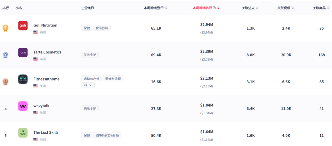 三、TikTok美区小店排行:Goli周销售额将近300万美金