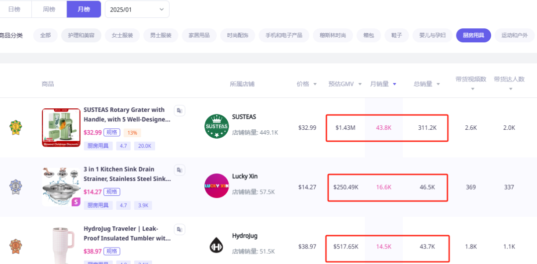 2025年1月底至2月初,受春节假期和传统淡季双重影响,美区TikTok电商大盘日销量普遍下滑,厨房用品类目也未能幸免。然而,在一片低迷中,三款产品却稳居销量前三,甚至展现出逆势增长的潜力: