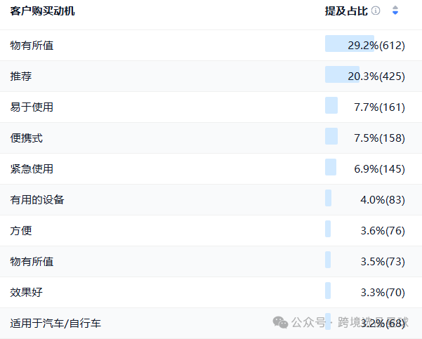购买动机:物有所值(29.2%):看重其经济性、高性能与优质制造;他人推荐(20.3%):因产品装置、保修服务等口碑良好;易用便携(18.1%):操作简单、体积小巧,适合车载及户外使用;紧急需求(12.4%):应对突发充气场景,内置照明等功能提升实用性;广泛适用(9.8%):兼容汽车/自行车等,满足多场景需求