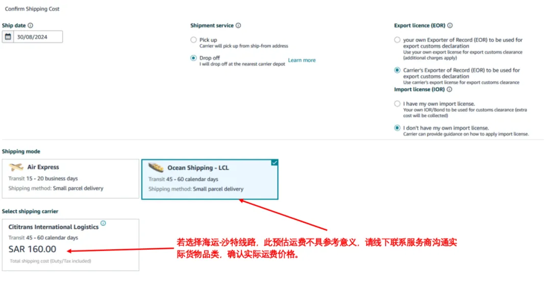 B.海运-LCL:阿联酋线路可参照预估运费金额报价;沙特线路由于货物类型分类较多,请线下联系服务商沟通实际货物品类,确认实际运费价格。
