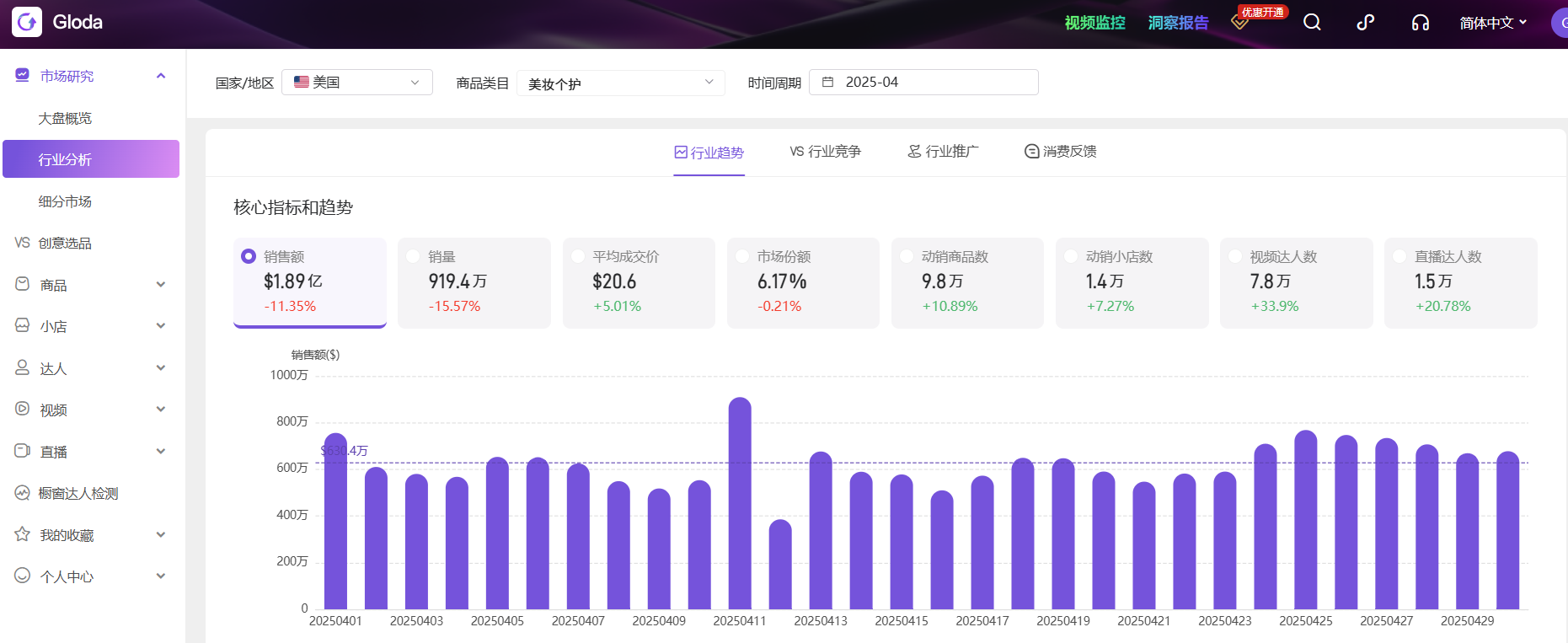 根据Gloda.vip的数据报告,2025年4月TikTok美国市场整体表现持续火热。美妆个护、女装与女士内衣、保健类产品等多个品类销售大涨,其中美妆个护销售额环比增长1.89亿美元,女装与女士内衣销售额增长超过1.25亿美元。