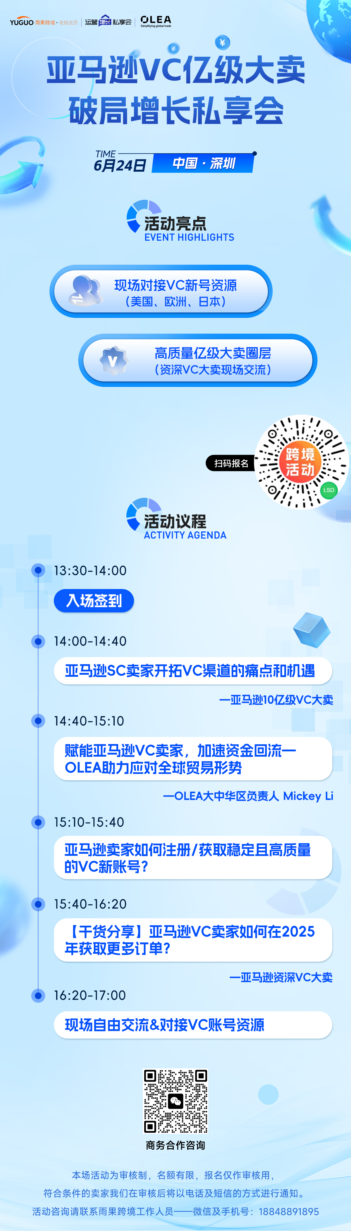 小贴士丨6月24日,亚马逊VC亿级大卖破局增长私享会将于深圳举办,届时亚马逊VC大卖将带来最新趋势解读,现场还可以获取VC账号入驻资源,感兴趣的卖家可以点击此处报名,快速抢占席位。名额有限,报名从速!