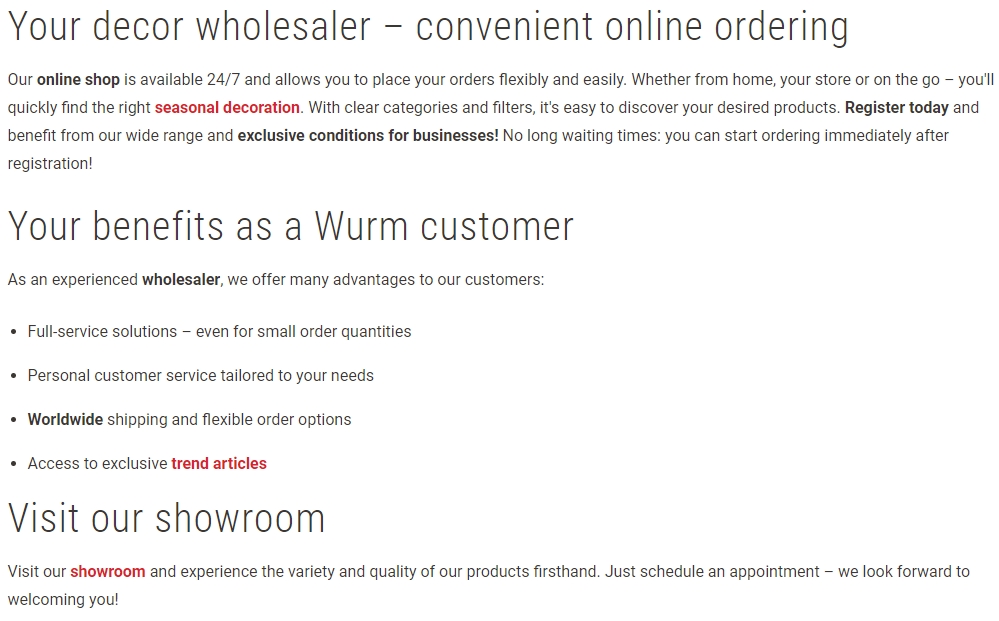 此外,G. Wurm还非常重视B2B采购意图关键词,比如deko großhandel、 großhandel deko,这类关键词明确指向“线上采购+批发意图”,这说明G. Wurm不仅通过风格装饰词引流,还深度构建了以成交为导向的B2B词池,这一策略有助于吸引高匹配度采购商,从而提升询盘质量与转化效率。