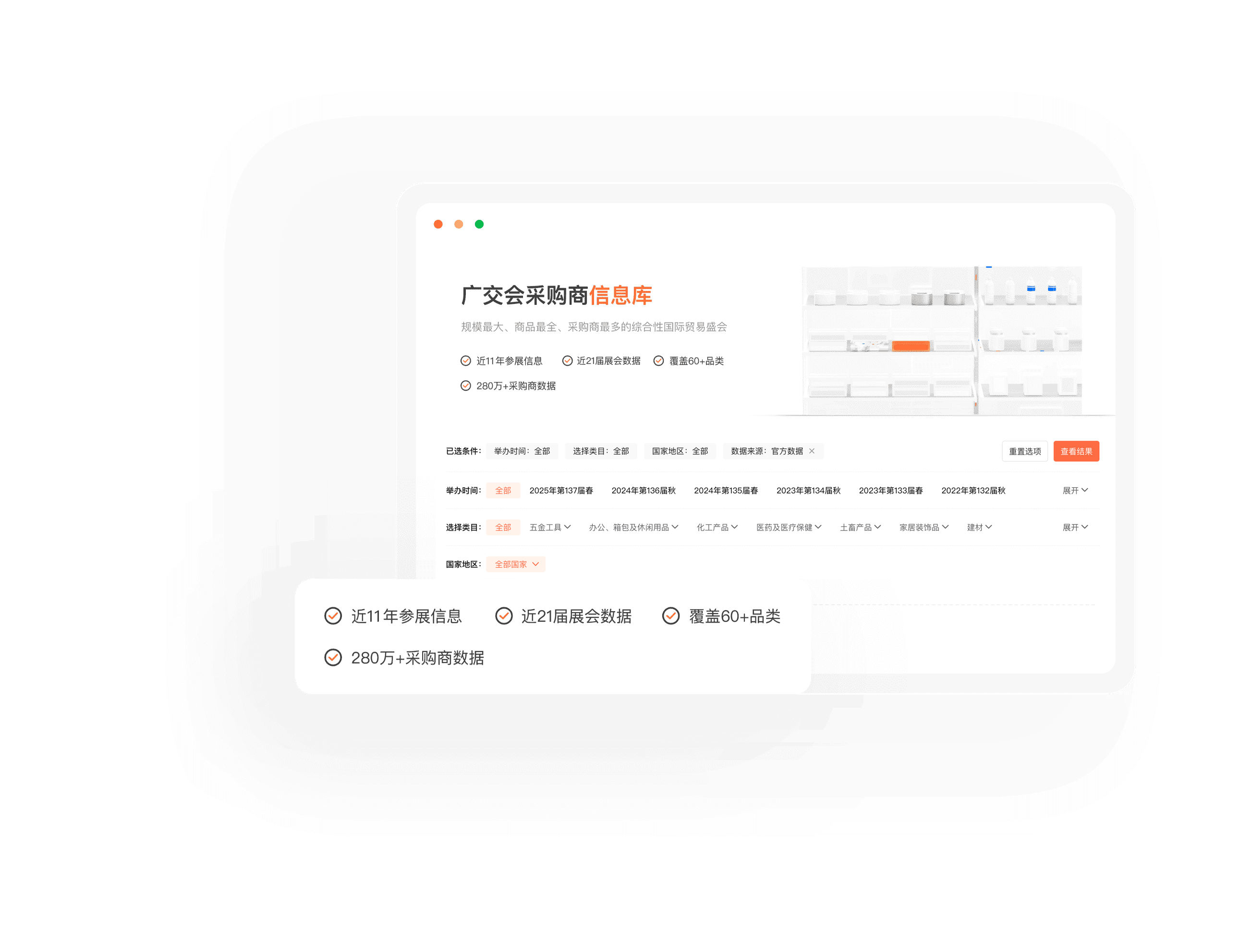 60+品类,超280万+家采购商数据,提供多重联系方式,无需参展,一键检索目标商家。